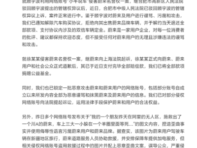 - 社会公益得益:蔚来法务部将赔偿款用于捐赠,不向“小牛说车”卖车