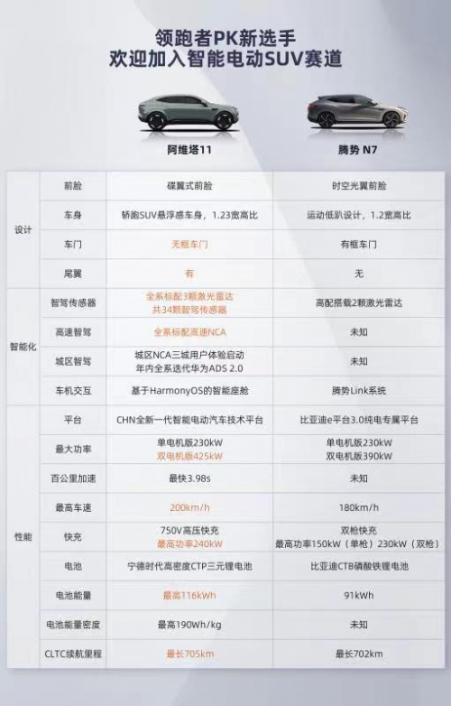 阿维塔11对比腾势N7,阿维塔设计、智能性均占上风!