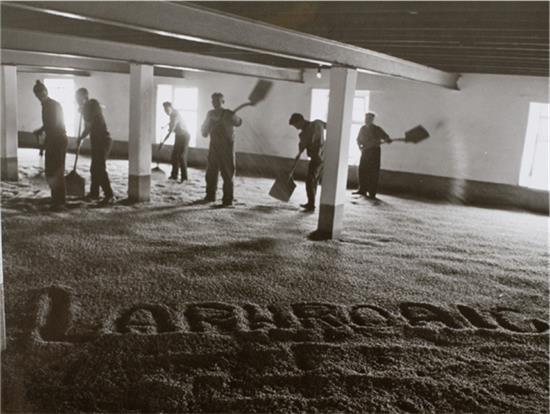 酒厂的翻麦工人在大麦发芽地板上划出"Laphroaig"(拉弗格)字样,摄于1965年