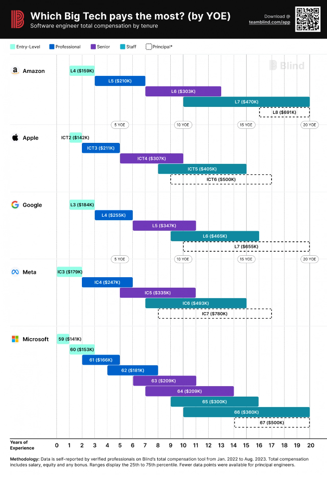 在具体数据方面,亚马逊的入门级工程师平均年薪约为15.9万美元,谷歌为18.4万美元,meta为17.9万美元,而苹果和微软分别为14.2万美元和14.1万美元。这些数据揭示了这些科技巨头之间的薪资差异。