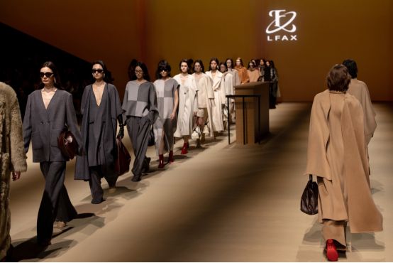 在秀场上,模特们身着LFAX品牌的廓形大衣、皮草外套和羊绒套装,以飘逸率性的姿态,展现出一种慵懒而惬意的风格。鲜明柔和的色调烘托出独立女性强大而又浪漫的内心世界,让人们在欣赏时尚的同时,也能感受到女性内心的力量与温柔。